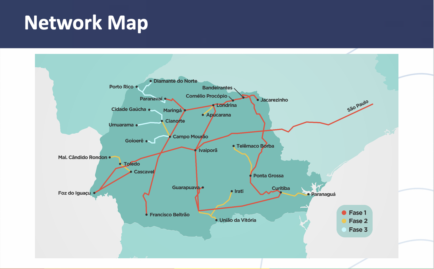 Legenda: mapa mostra as conexões feitas, em diferentes etapas, do projeto Rede Paranaense de Supercomputação (Créditos: NTI UEPG)